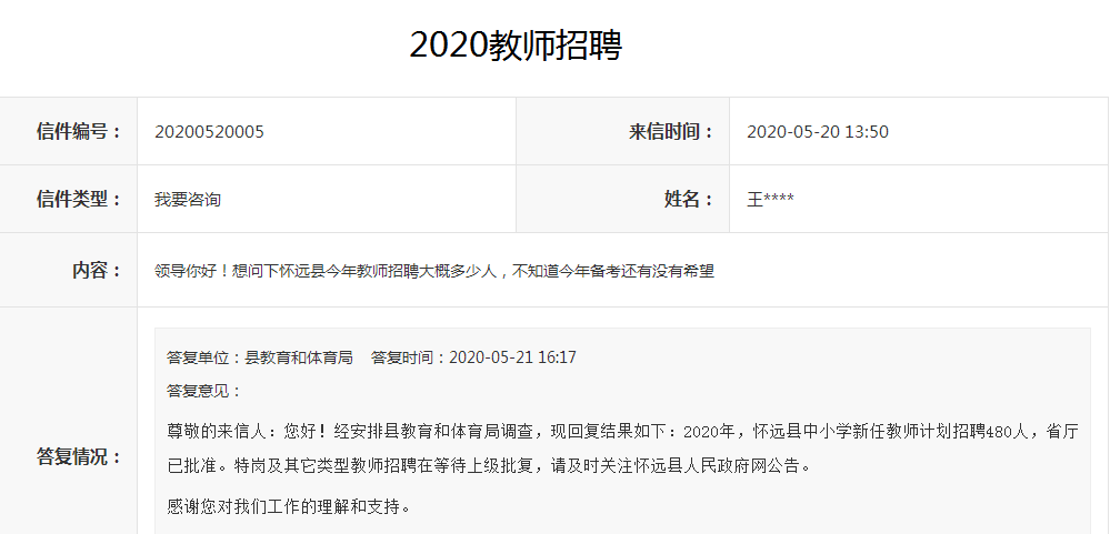 尊敬的來信人:您好!經(jīng)安排縣教育和體育局調(diào)查,現(xiàn)回復結果如下:2020年,懷遠縣中小學新任教師計劃招聘480人,省廳已批準。特崗及其它類型教師招聘在等待上級批復,請及時關注懷遠縣人民政府網(wǎng)公告。