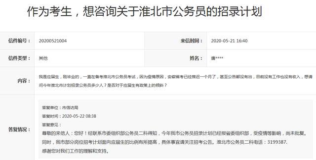 信件內(nèi)容:我是應(yīng)屆生,剛畢業(yè)的,一直在備考淮北市公務(wù)員考試,因為疫情原因,安徽省考已經(jīng)推遲一個月了,甚至公告都沒有出,目前沒有工作也沒有收入,想請問今年淮北市計劃招錄公務(wù)員多少人?是否對于應(yīng)屆生有政策上的傾斜?