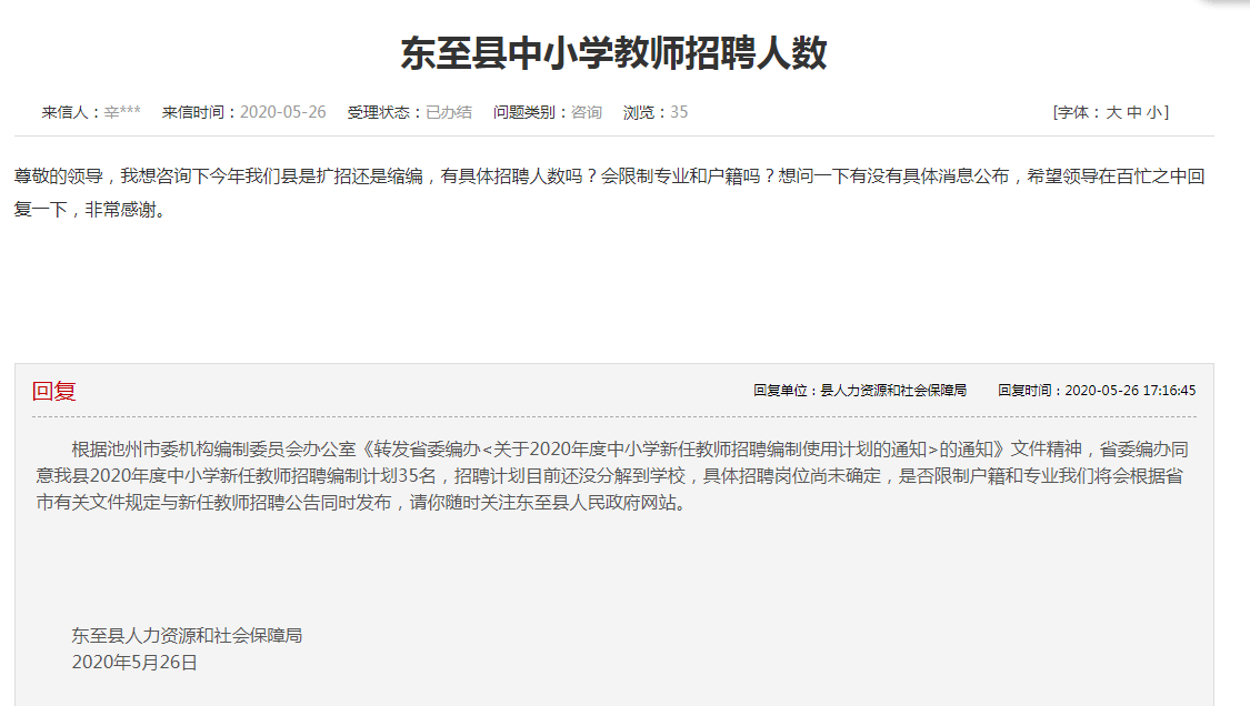 縣人力資源和社會保障局回復根據(jù)池州市委機構(gòu)編制委員會辦公室《轉(zhuǎn)發(fā)省委編辦<關于2020年度中小學新任教師招聘編制使用計劃的通知>的通知》文件精神,省委編辦同意我縣2020年度中小學新任教師招聘編制計劃35名,招聘計劃目前還沒分解到學校,具體招聘崗位尚未確定,是否限制戶籍和專業(yè)我們將會根據(jù)省市有關文件規(guī)定與新任教師招聘公告同時發(fā)布,請你隨時關注東至縣人民政府網(wǎng)站。