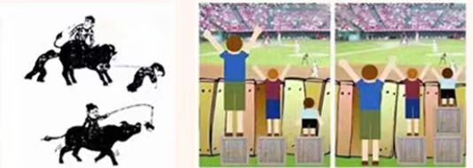 右邊漫畫(huà):左邊是三個(gè)人(從左到右身高依次遞減),踩著同樣的方箱趴在墻外看足球場(chǎng)上人踢足球。右邊是同樣場(chǎng)景,但是三個(gè)不同身高的人下面踩的方箱依次遞增。對(duì)此,你想到了什么?