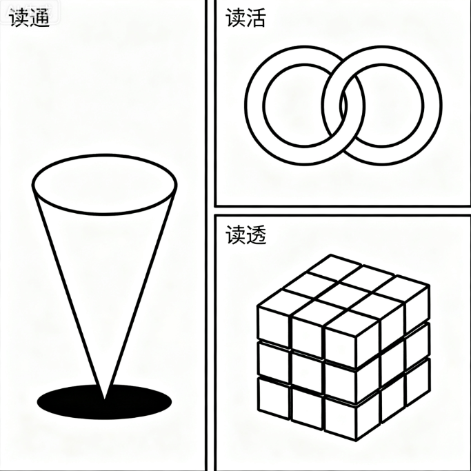 第四題、漫畫題,三個圖片,一個圖片是倒著的圓錐,一個是兩個扣住的圓圈,一個是一堆小正方體組成了一個大正方體,三個圖片代表著對讀書的不同方式,談?wù)勀銓ψx書讀通,讀活、讀透的看法。